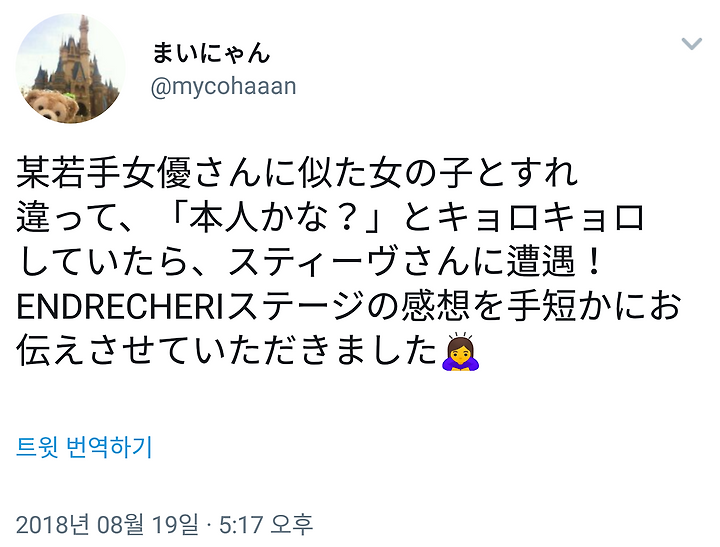 모 젊은 여배우가 비슷한 여자와 스쳐서, "본인인가?" 라고 어리둥절 하고 있었더니 스티브씨와 조우! ENDRECHERI 스테이지의 소감을 짧게 전할 수 있었습니다 🙇 ♀ ️