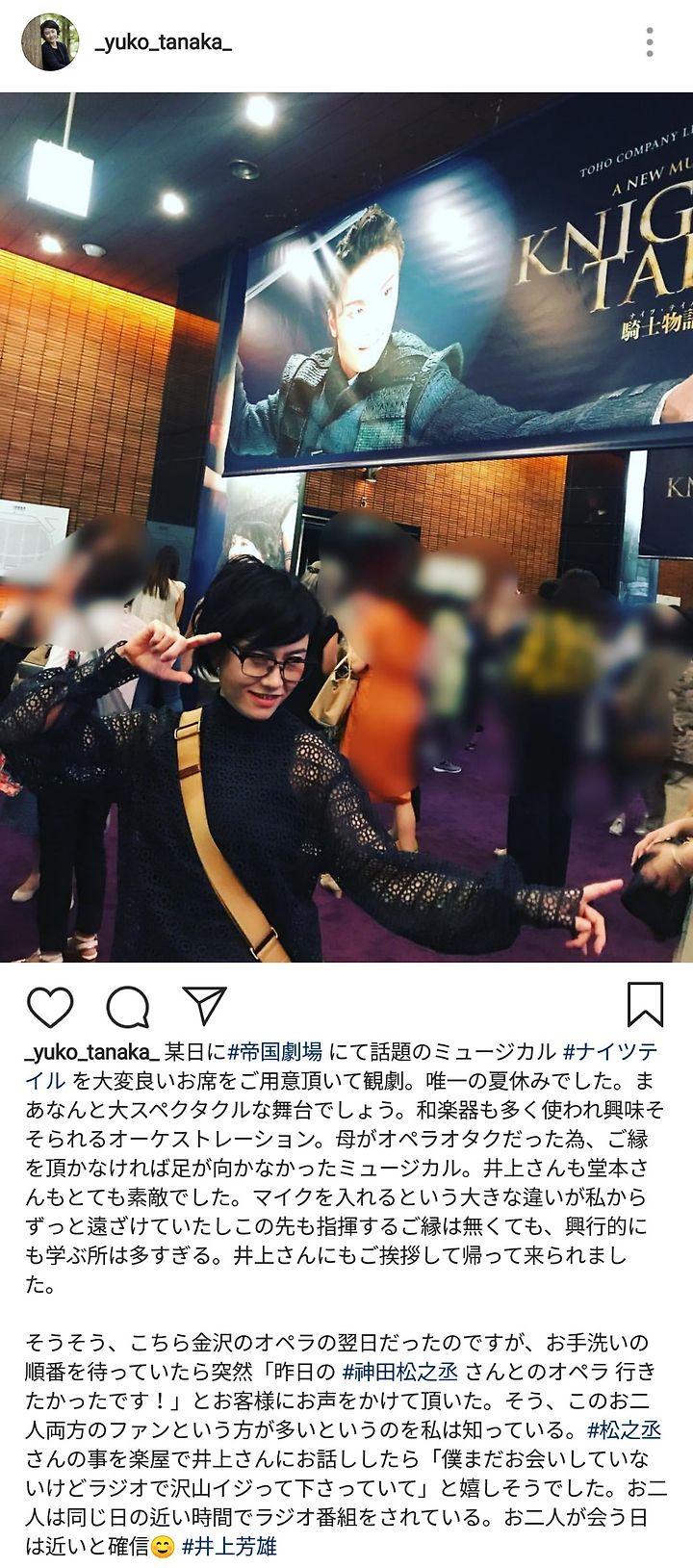 _yuko_tanaka_모일에 제국 극장에서 화제의 뮤지컬 나이츠 테일을 매우 좋은 좌석을 마련해주셔서 관극. 유일한 여름 휴가였습니다. 뭐, 무려 대스펙터클한 무대에요. 일본 악기도 많이 사용된 흥미로운 오케스트레이션, 엄마가 오페라 마니아였기 때문에 인연을 받지 않으면 발이 내키지 않았던 뮤지컬. 이노우에씨도 도모토씨도 아주 멋있습니다. 마이크를 사용한다는 큰 차이 때문에 계속 외면하고 있었습니다. 앞으로도 지휘하는 인연은 없어도, 흥행적으로는 배울 점이 너무 많은 이노우에씨에게도 인사하고 돌아왔습니다.