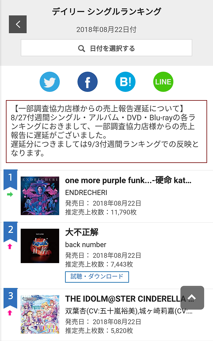 [도모토 쯔요시] 8/22 오리콘 데일리 싱글 랭킹 one mor purple funk (1위)