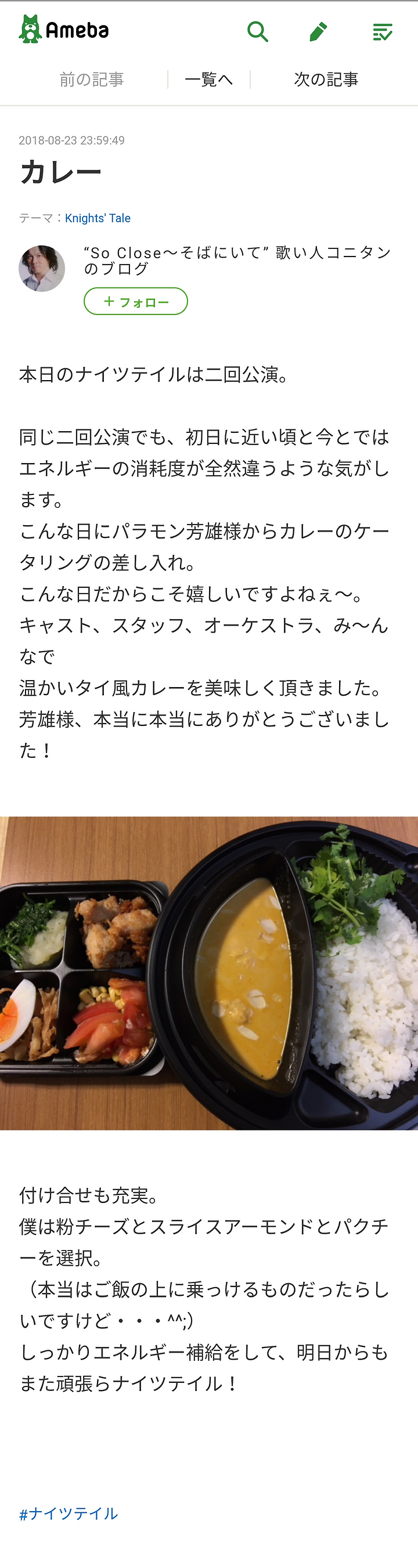 今夜もナイツテイル最高だった!女性陣若干歌声に疲労が窺えましたが、光一さん喉絶好調じゃない!?(井上君も当然w)カテコで背中に「ラ」「ブ」と文字を貼ってきたダンサーさんの背中を見るために服をめくり上げてみてたアーサイトと、そんなアーサイトを回収しにきたエミーリアかわゆす(*´ω`*)