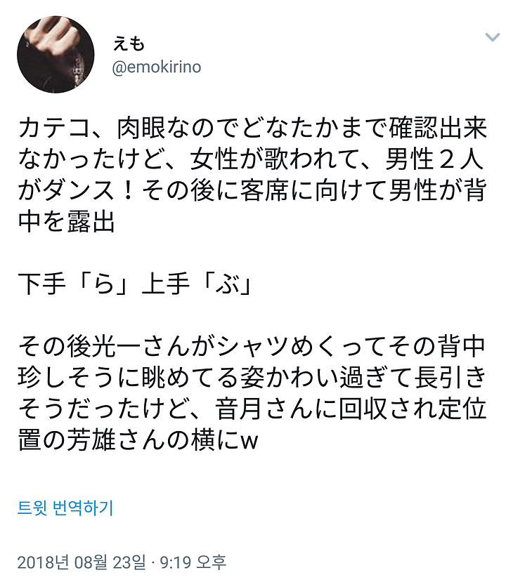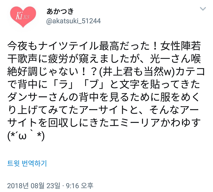 오늘밤도 나이츠는 최고였다! 여성진 약간 목소리에 피로가 보였는데 코이치씨 목 절호조네!? (이노우에군도 당연히w) 커트놀에서 등에 "러" "브" 라고 문자를 붙이고 온 댄서 분의 등을 보기 위해서 옷을 들춰서 보고 있던 아사이트와 그런 아사이트를 회수하러 온 에밀리아가 귀엽습니다 (*'ω`*)