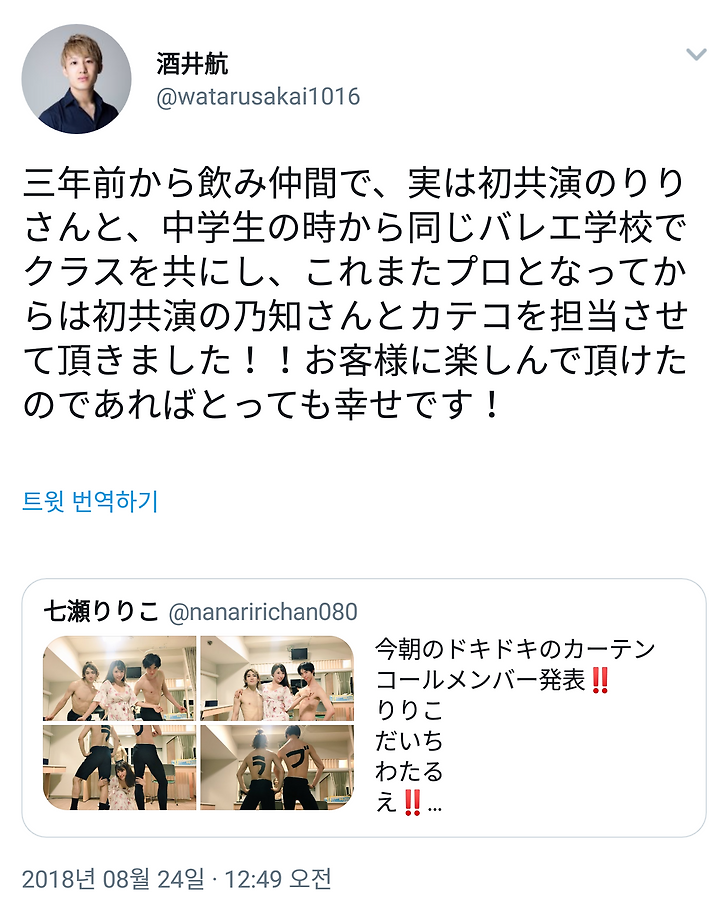 삼년 전부터 술친구로 사실 첫 협연인 리리상과 중학교 때부터 같은 발레 학교에서 클래스를 함께 하고, 이 또한 프로가 되고부터는 첫 협연인 다이치씨와 커튼콜을 담당했습니다! 관객께서 즐겨주셨다면 너무나 행복합니다!https://t.co/ukE5kHYOcK