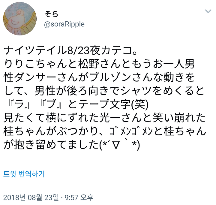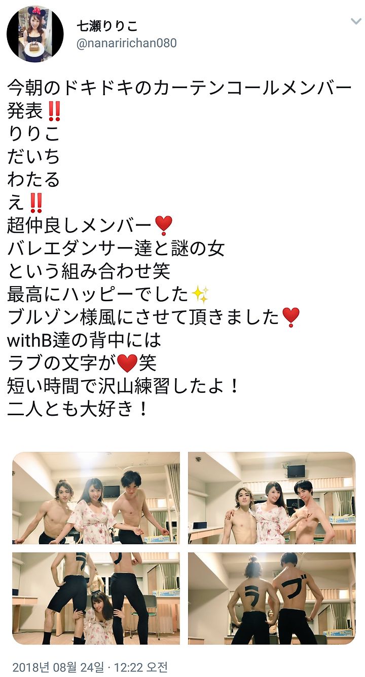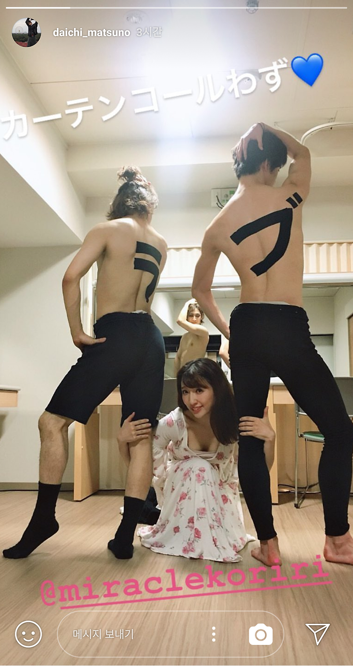 리리코짱과 마츠노상과 또 한 명의 남자 댄서 분이 블루종상의 직임을 하고, 남자가 돌아서서 셔츠를 딱 넘기자『라』 『 부』라는 테이프 문자ㅎㅎ