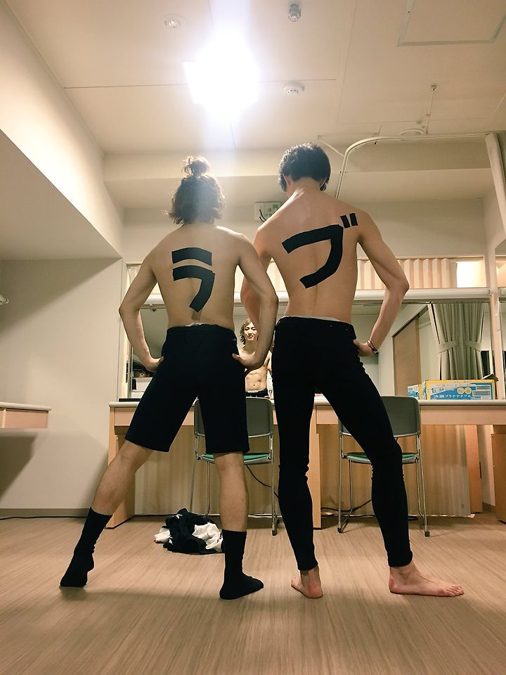 りりこちゃんと松野さんともうお一人男性ダンサーさんがブルゾンさんな動きをして、男性が後ろ向きでシャツをめくると『ラ』『ブ』とテープ文字(笑)