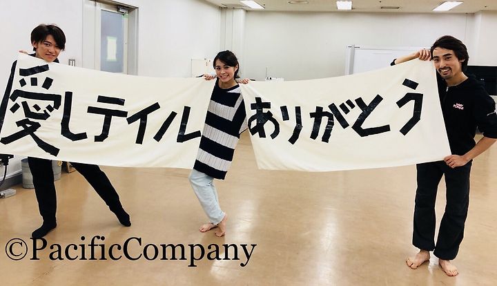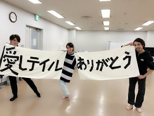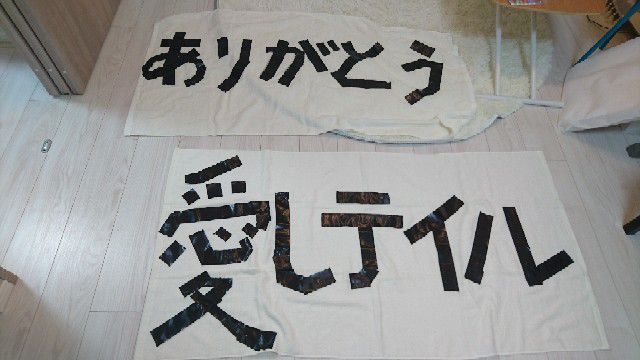 カテコは男性2人と女性1人。バスタオル2枚持って出て来て、芳雄くんと光一さんにパフォーマンス中は持たせてたけど、光一さん受けとる時、不服そうw光一さんと芳雄さん組、アンサンブル組に分かれてタオル広げると黒ガムテープで「愛しテイル」「ありがとう」そして光一さんはテの点をやっぱり剥がすw