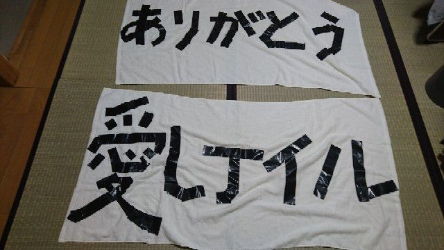 8/25밤 커튼콜, 2장의 천을 앙상블분이 가지고 와서 코이치씨와 요시오씨가 열어 보니 검은 테이프로 만들어진 "아이시테이루" "아리가토우"의 글씨가!(°_°) 하지만 그 천으로 이마의 땀을 닦는 두 사람 w