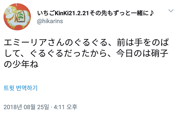 에밀리아상의 빙글빙글, 앞으로 손을 뻗고 빙긍빙글이었으니 오늘 건 가라스노쇼넨이네