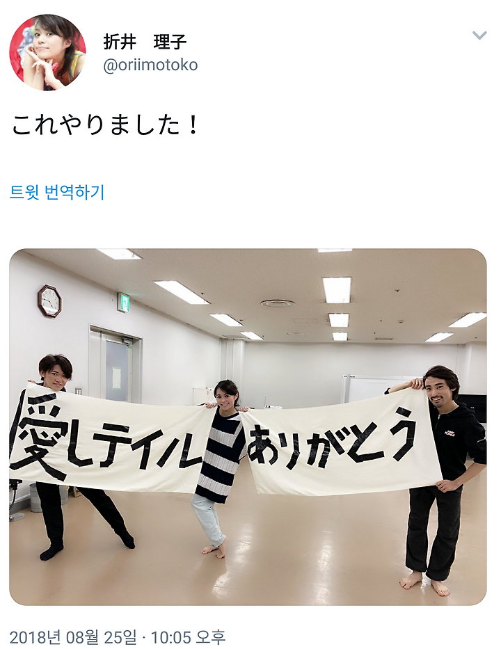 커튼콜은 남자 둘과 여자 한 명. 바스타올 2장 갖고 나와서, 요시오군과 코이치상에게 퍼포먼스 중에는 들게 했는데 코이치상 받을 때 마땅찮아 보이는 표정 w 코이치씨와 요시오씨 팀, 앙상블 팀으로 나뉘어 수건 펼치자 검정 테이프로 "아이시테이루" "아리가토우" 그리고 코이치 씨는 "테"의 점을 역시 떼고 w