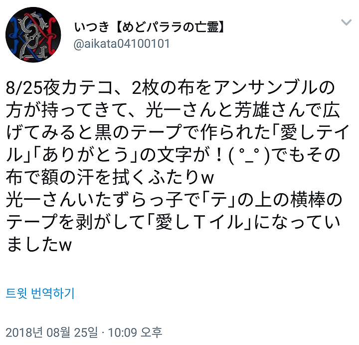커튼콜에서 2장의 바스타올 가지고 온 앙상블씨, 1장씩 코짱과 요시오군에게 건네고 노래 끝난 시점에서 펼치니 "아이시테이루" "아리가토우"라고. 아이시테이루 쪽을 요시오과 코짱이 들고 있었는데 펼친 순간부터 어디를 뗄 지 생각하는 듯이 들여다 보는 코짱 w