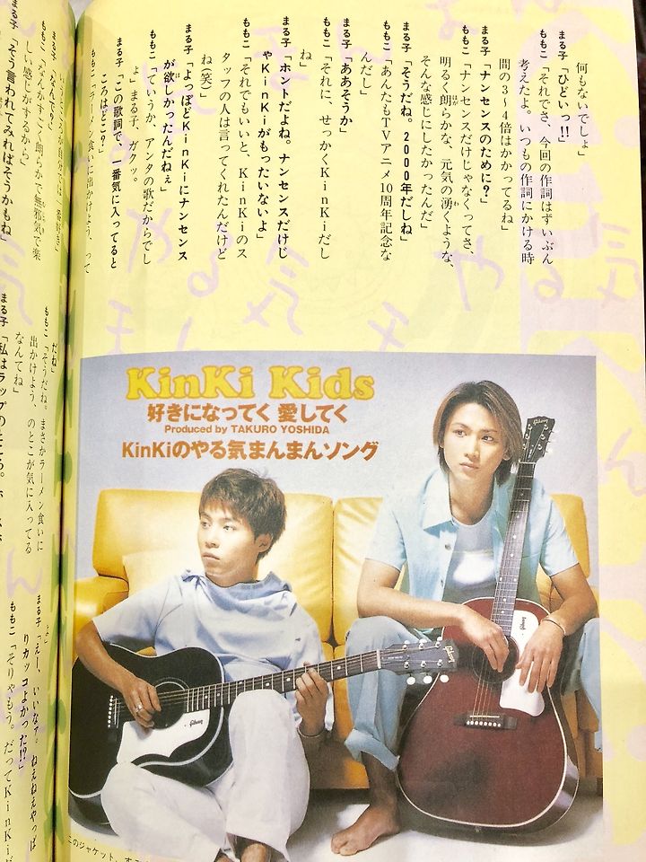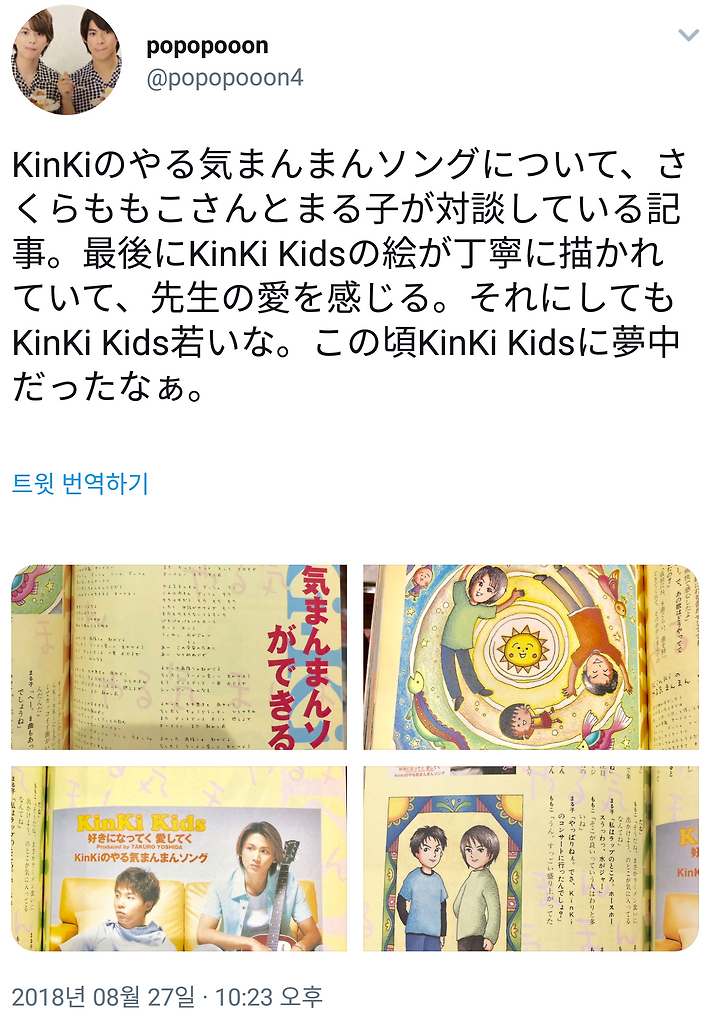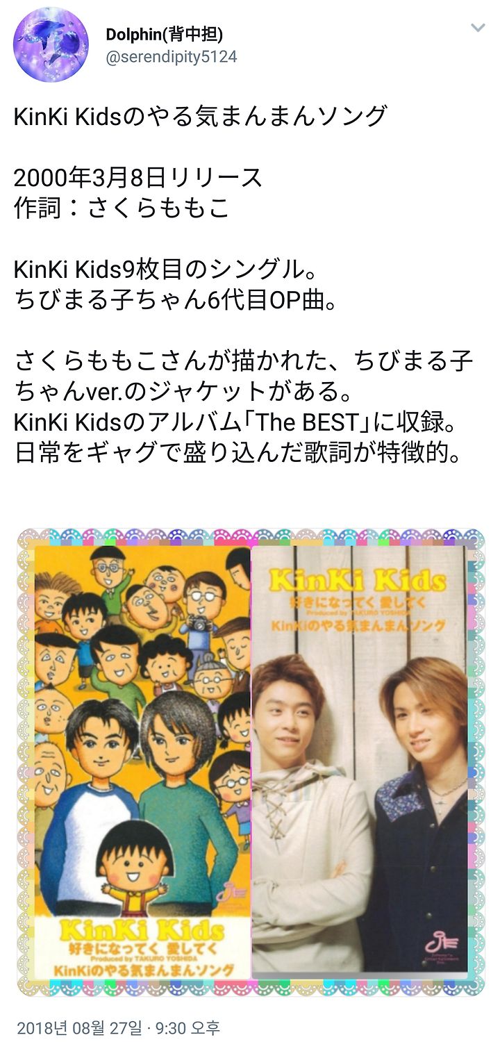 KinKi의 야루키만만 송에 대해서, 사쿠라 모모코씨와 마루코가 대담하고 있는 기사. 마지막에 KinKi Kids의 그림이 정중하게 그려져 있어 선생님의 사랑을 느낀다. 그렇다하더라도 KinKi Kids 젊다. 이 무렵 KinKi Kids 몰두였었지.https://t.co/LxsCEWqvij
