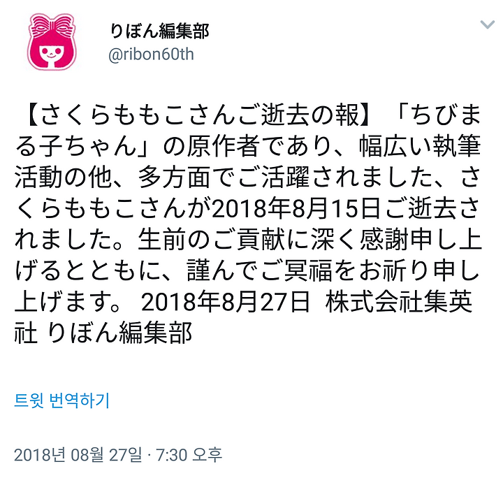 [사쿠라 모모코씨 서거 소식] "치비마루코"의 원작자이며 폭넓은 집필 활동 외, 다방면에서 활약한, 사쿠라 모모코씨가 2018년 8월 15일 서거하셨습니다. 생전에의 공헌에 깊이 감사 드리며, 삼가 명복을 빕니다. 2018년 8월 27일 주식 회사 슈에이샤 리본 편집부