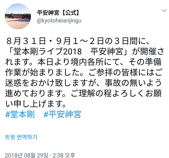 8월 31일 9월 1~2일 3일 간 "도모토 쯔요시 라이브 2018 헤이안진구"가 개최됩니다. 오늘부터 경내 곳 곳에서 그 준비 작업이 시작되었습니다. 참배의 여러분에게는 폐를 끼치겠습니다만, 사고 없도록 진행하고 있습니다. 양해 부탁 드립니다.