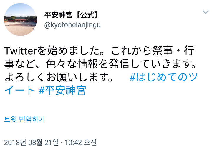Twitter를 시작했습니다. 앞으로 제사 행사 등 여러가지 정보를 발신하겠습니다. 잘 부탁 드립니다.#첫 트윗#헤이안 신궁