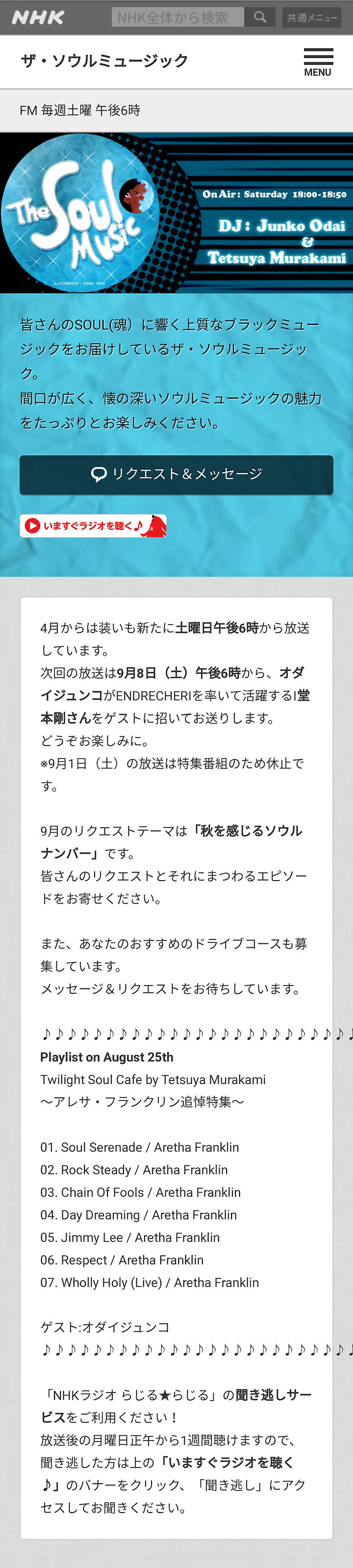 次回の放送は9月8日(土)午後6時から、オダイジュンコがENDRECHERIを率いて活躍するI堂本剛さんをゲストに招いてお送りします。