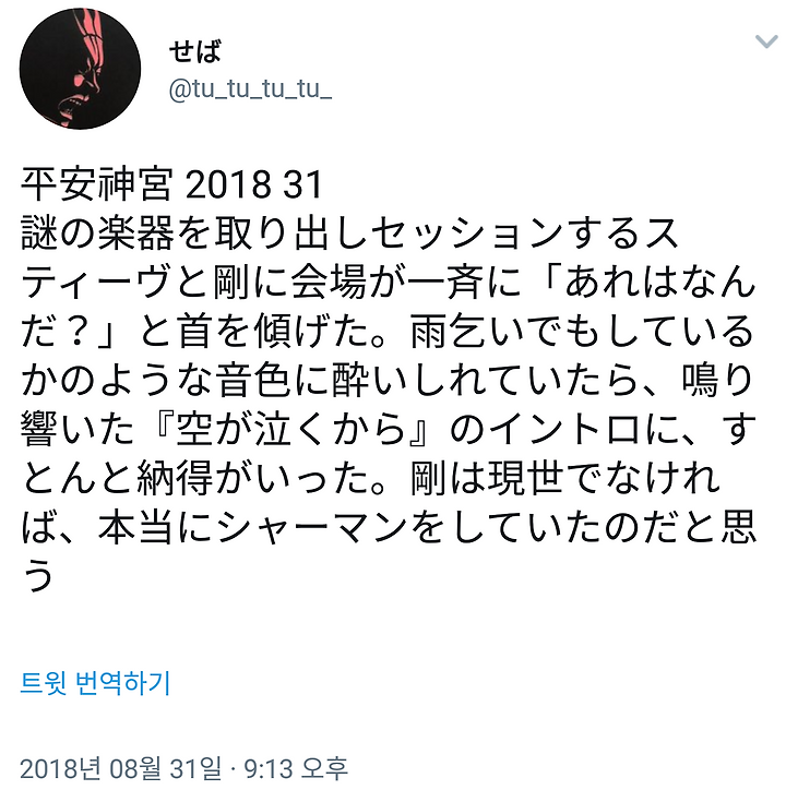 수수께끼의 악기를 꺼내 세션하는 스티브와 쯔요시에 회장이 일제히 "저게 뭐야?" 하고 고개를 갸웃거렸다. 기우제라도 하는 듯한 음색에 취해있었더니 울려퍼진『소라가나쿠까라』의 인트로에 쿵 하고 납득이 갔다. 쯔요시는 현세가 아니면 정말 샤먼을 하고 있었을 거라고 생각한다