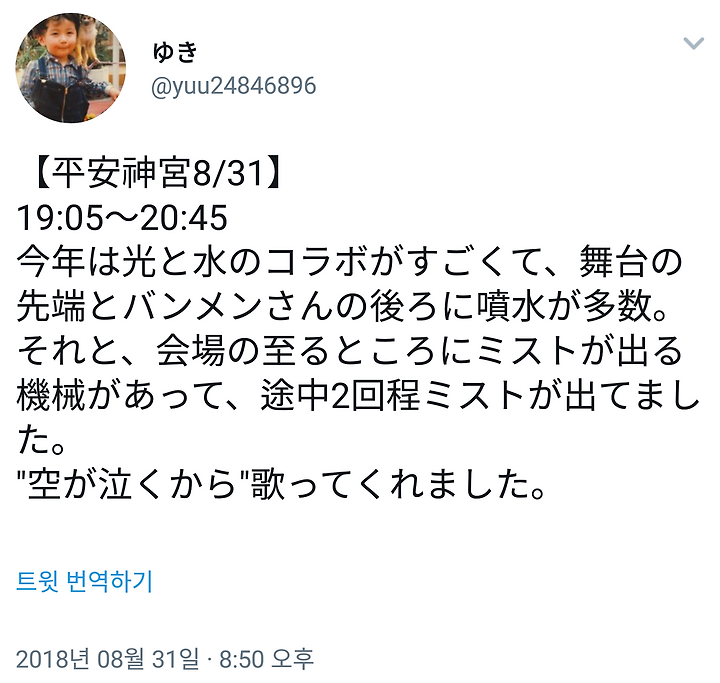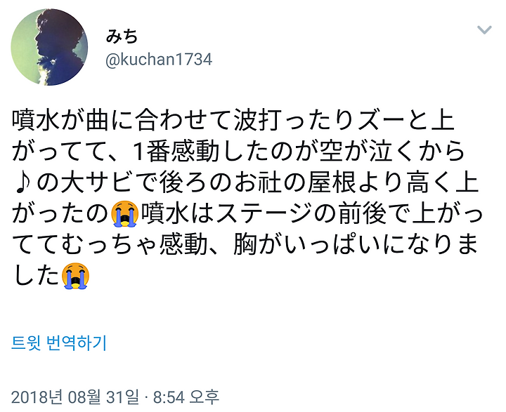 분수가 곡에 맞추어 파도를 일으키거나 오르거나 했는데, 가장 감동시킨 것은 소라가나쿠까라♪의 대사비에서 뒤쪽 당의 지붕보다 높이 올라갔어 😭 분수는 스테이지 앞뒤로 올라가서 매우 감동, 가슴이 가득 찼습니다 😭