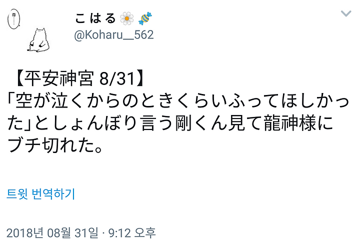 「空が泣くからのときくらいふってほしかった」としょんぼり言う剛くん見て龍神様にブチ切れた。