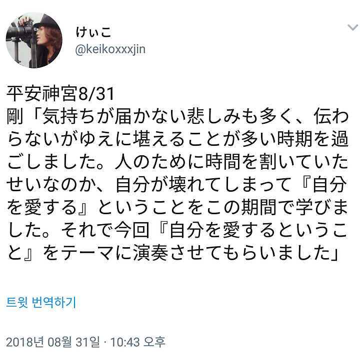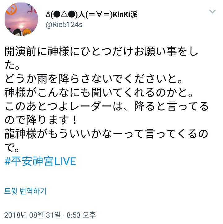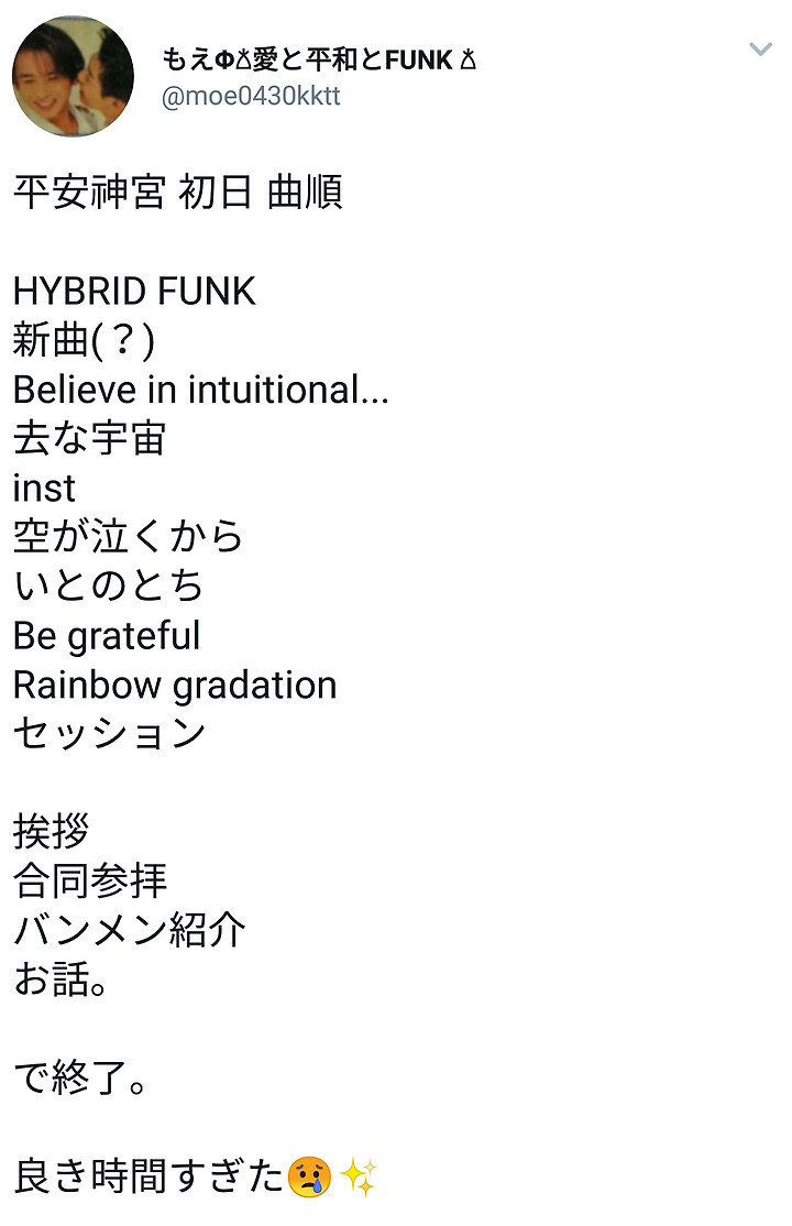 毎年平安神宮さんやる時に色々相談したり話を聞いてくれてた宮司さんが天へ昇ってしまった今もお空で聞いてくれてると思うんですけど。みなさんいつも言ってますが人生1度きりです1度きりの人生まずは自分のためにいきてください愛してあげてください(ニュアンス)涙声に聴こえたよ