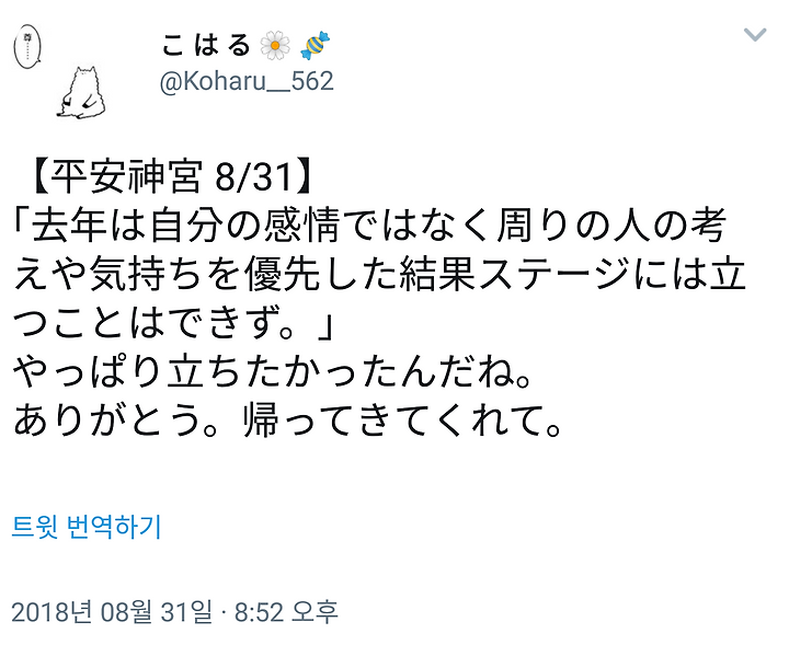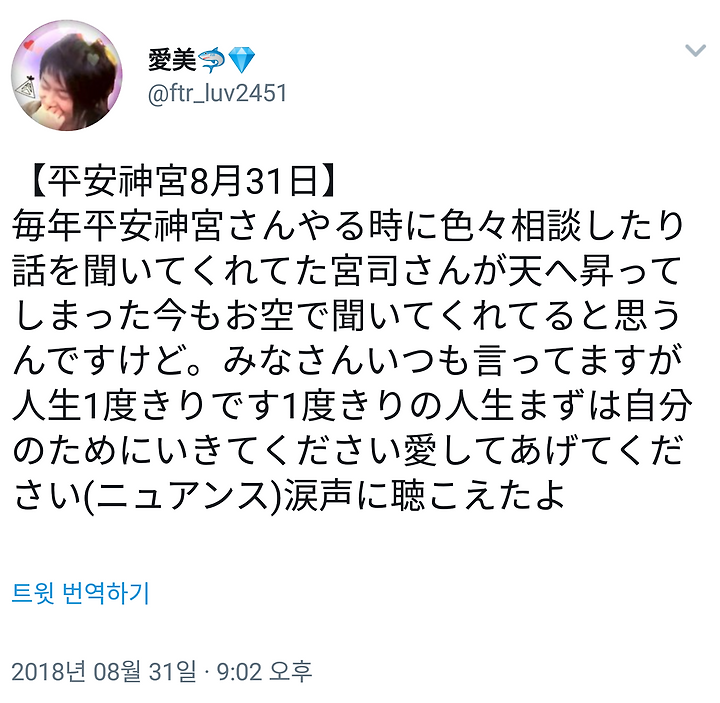 매년 헤이안 신궁씨 할 때에 여러가지 상의하거나 이야기를 들어 준 신관님이 하늘로 떠나버린 지금도 하늘에서 들어 주실거라고 생각합니다만. 여러분 언제나 말하지만 인생 1번뿐입니다 1번뿐인 인생 먼저 자신을 위해 가주세요 사랑해주세요(뉘앙스) 우는 목소리로 들렸어