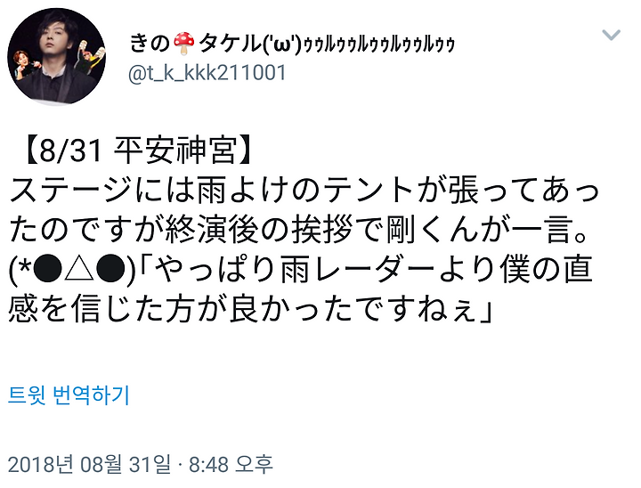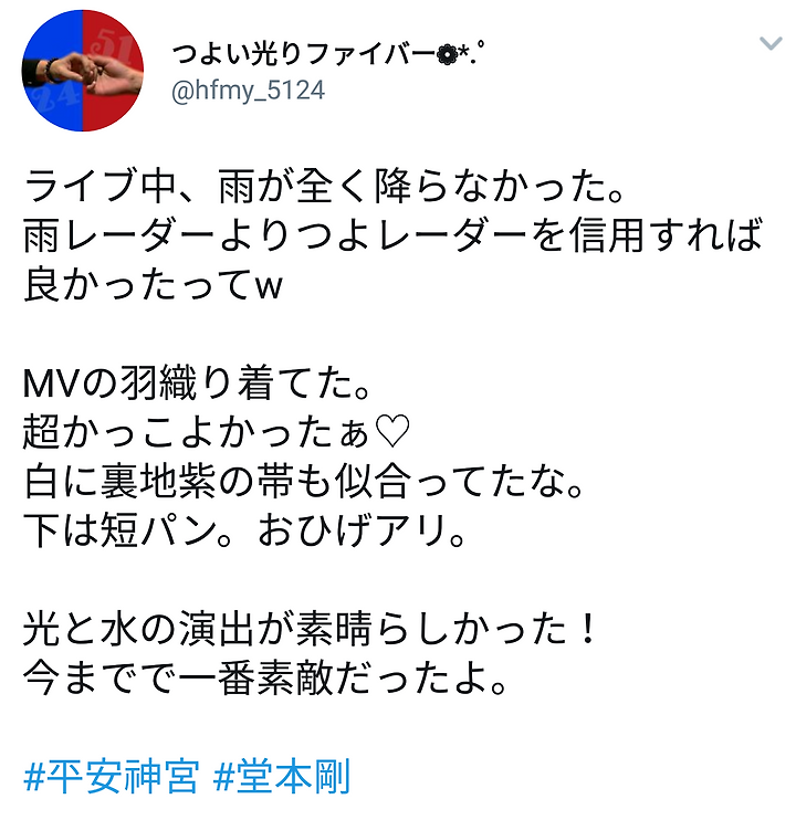 テントをしまわないか?とスタッフに提案するものの、雨レーダーがあるので...と断られてしまった剛くん。結果公演中は雨が一滴も降らなかった。