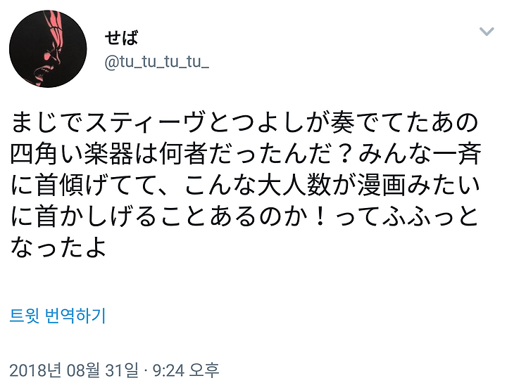 진짜 스티브와 쯔요시가 연주했던 네모난 악기는 뭐였어? 모두 일제히 고개 갸웃하고 이런 많은 인원이 만화처럼 고개 갸우뚱하는 일이 있을까!라며 쿠후후 했다