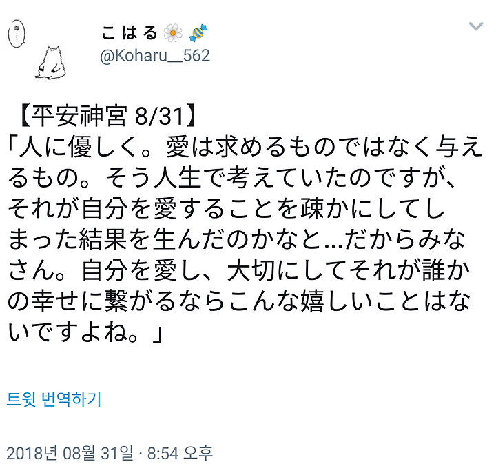 "사람에세 상냥하게 . 사랑은 요구하는 것이 아니라 주는 것. 그렇게 인생에서 생각하고 있었는데, 그것이 자신을 사랑하는 것을 소홀히 해서 버린 결과를 낳은 걸까나 하고...그러니까 여러분. 자신을 사랑하고 소중히 여기고 그것이 누군가의 행복으로 이어진다면 이렇게 기쁜 일은 없겠네요."