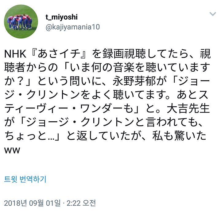 NHK『 아사 이치』을 녹화 시청했더니 시청자의 "지금 무슨 음악을 들나요?" 라는 질문에 나가노 메이가 "조지 클린턴을 자주 듣네요. 그리고 스티비 원더도"라고. 오오키치 선생이 "조지 클린턴이라고 들어도 좀..." 이라고 했지만 나도 놀랐다 ww