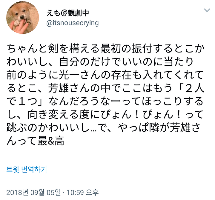 제대로 칼을 겨누는 최초의 안무하는 거 정말 귀엽고 자기만 하면 되는데 당연하다는 듯이 코이치상의 존재도 넣어 주는 것, 요시오상 안에서 여기는 이제 "둘이서 하나" 인거구나 라며 훈훈하고 방향 바꿀 때마다 폴짝!폴짝! 뛰는 것 정말 귀엽고....그래서 역시 옆이 요시오씨라는 건 최&고