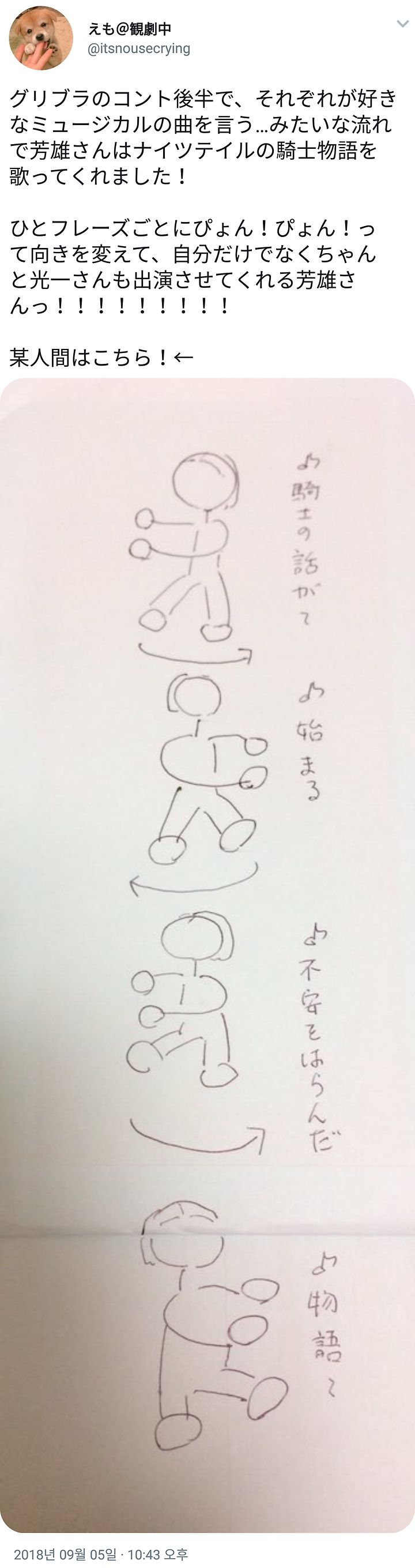 그리브라의 콩트 후반에서, 각각이 좋아하는 뮤지컬의 곡을 한다... 같은 맥락에서 요시오씨는 나이츠 테일의 기사 이야기를 부르셨어요!