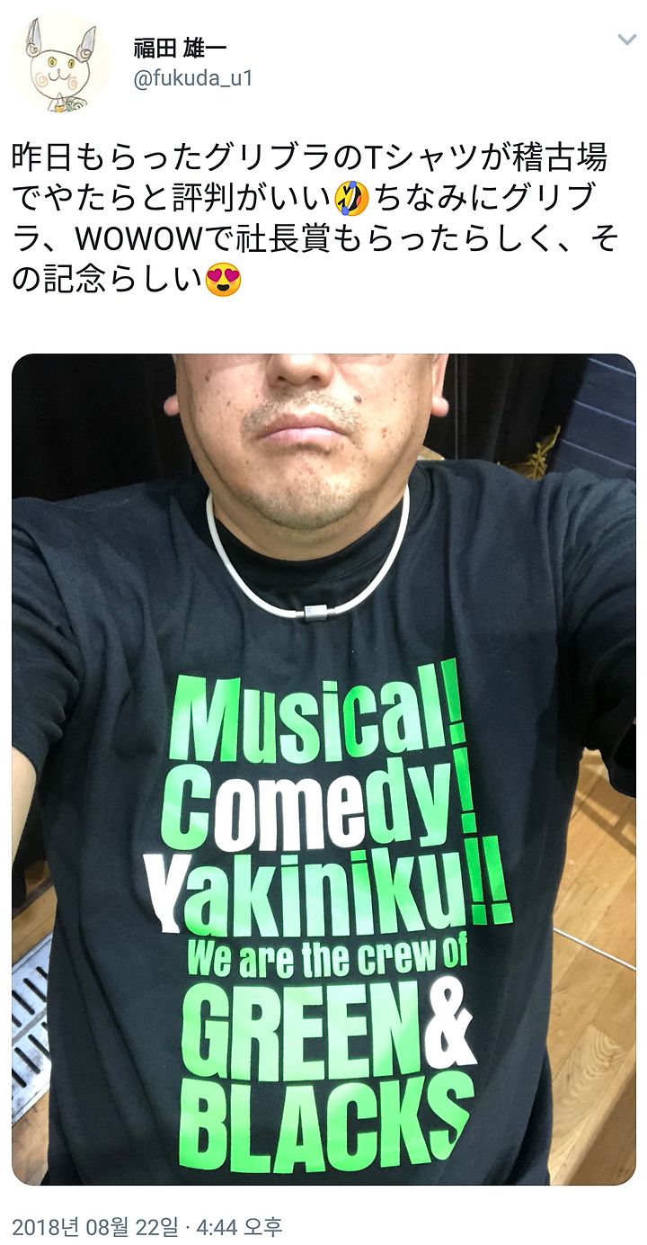 어제 받은 그린 블랙 T셔츠가 연습장에서 상당히 평판이 좋응🤣 그리고 그린 블랙 WOWOW에서 사장상 받은 듯 해서 그 기념이라나봐 😍 https://t.co/VeLE3IdKQJ