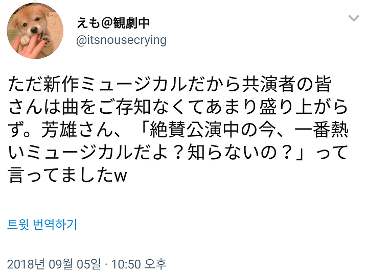 다만 신작 뮤지컬이기 때문에 협연자들은 곡을 알지 못해 별로 호응이 뜨겁지 않은. 요시오씨, "절찬리 공연 중인 지금 가장 핫한 뮤지컬이라구. 몰라?"라고 말했어요 w