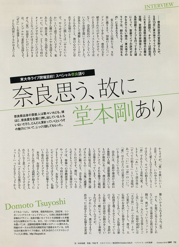 나라에는 불교나 신도에서 가르침을 받는 무상(無償, 대가를 바라지 않음)의 인덕, 도덕 윤리 같은 것이 근저에 있어서 저는 종교가는 아니지만 그것을 멋대로 흡수해서 음악을 하고 있습니다. 애초에 음악의 원점은 부처님이나 신에게 바치기 위한 것 ─ 대지에 감사하기 위해 춤추거나, 소리를 울리거나 했던 것입니다. 저는, 언제나 하게 해주시는 헤이안진구의 라이브는 신에 대한 봉납 연주로서 하고 있습니다. 이번의 토다이지 라이브도 그렇겠습니다만 관객에게 선물하는 것은 아니라 부처님과의 이야기를 관객이 목격한다고 하는 형식의 라이브입니다.
