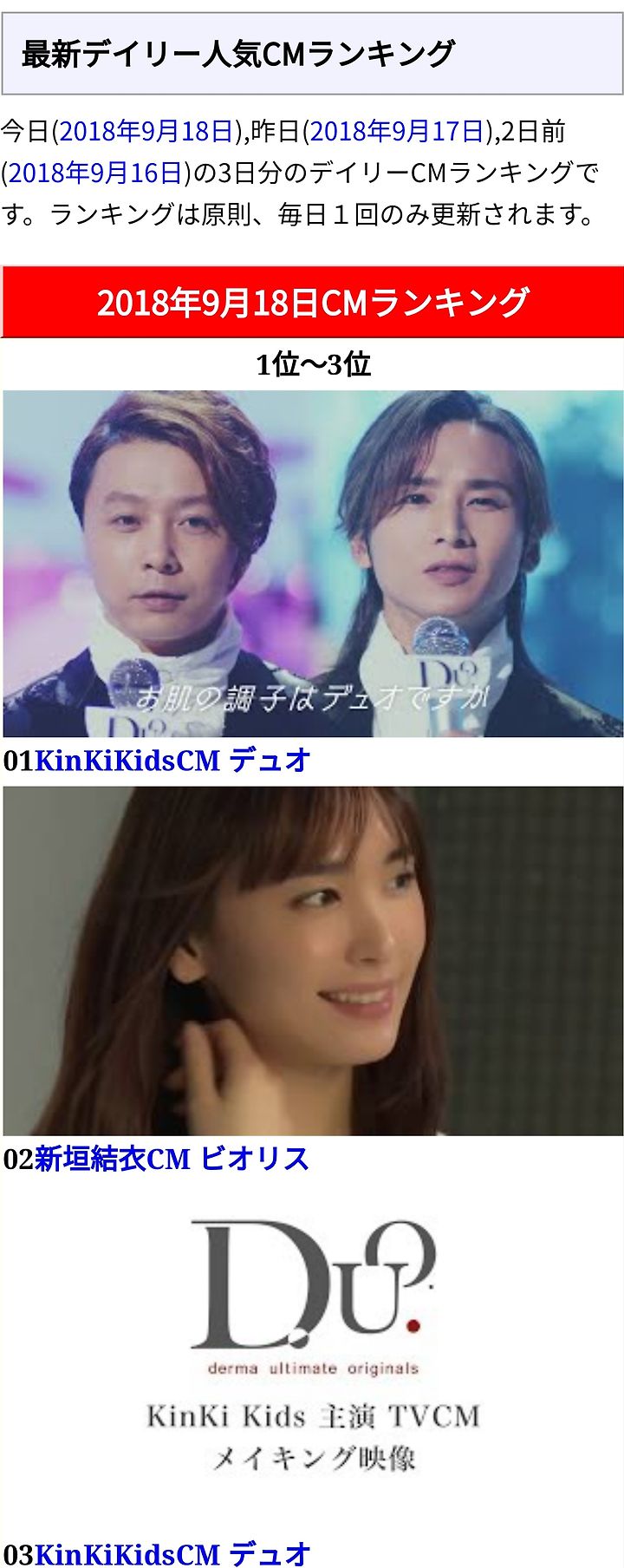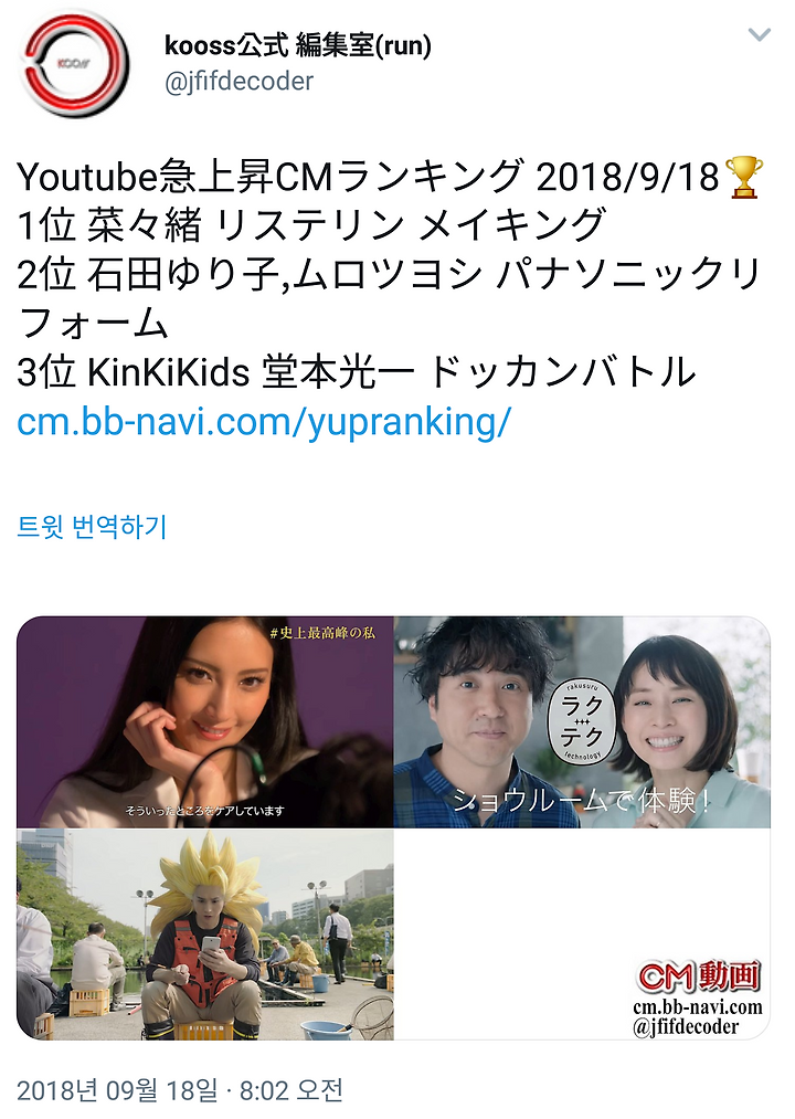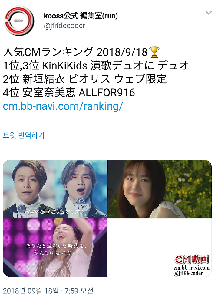 [KinKi Kids] 9/18 인기 CM랭킹 (듀오 클렌징밤 1위) & Youtube 급상승 CM랭킹 (돗캉배틀 3위)