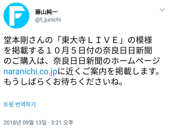 도모토 쯔요시상의 "동대사 LIVE"의 모습을 게재하는 10월 5일자의 나라 일일 신문 구입은 나라 일일 신문 홈페이지 https://t.co/1NXEzOWGyh에 조만간 안내를 게재하겠습니다. 조금 더 기다려주세요.