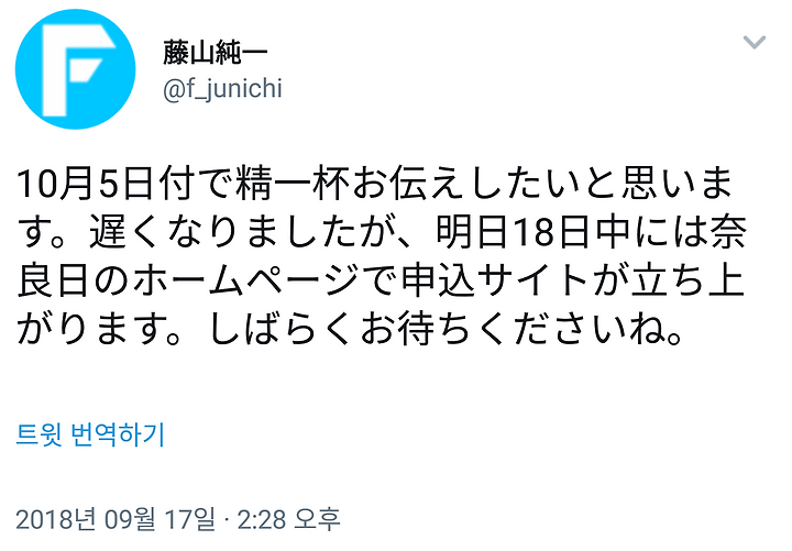 10월 5일자로 한껏 전하고 싶다고 생각합니다. 늦었지만 내일 18일 중에는 나라니치 홈페이지에서 신청 사이트가 세워집니다. 잠시 기다리세요.