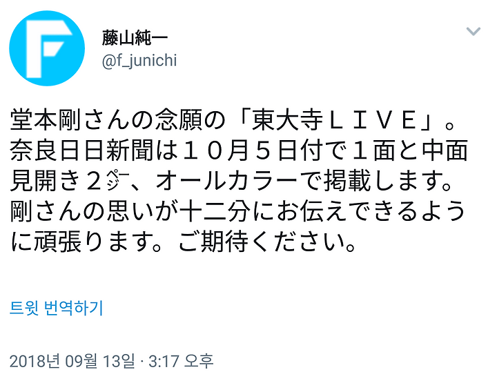 堂本剛さんの念願の「東大寺LIVE」。奈良日日新聞は10月5日付で1面と中面見開き2㌻、オールカラーで掲載します。剛さんの思いが十二分にお伝えできるように頑張ります。ご期待ください。