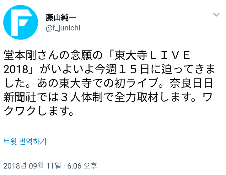도모토 쯔요시상의 염원의 "동대사 LIVE 2018"이 드디어 이번 주 15일로 다가왔습니다. 그 도다이지에서의 첫 라이브. 나라 일일 신문사에서는 3명 체제로 전력 취재합니다. 두근 두근 합니다.