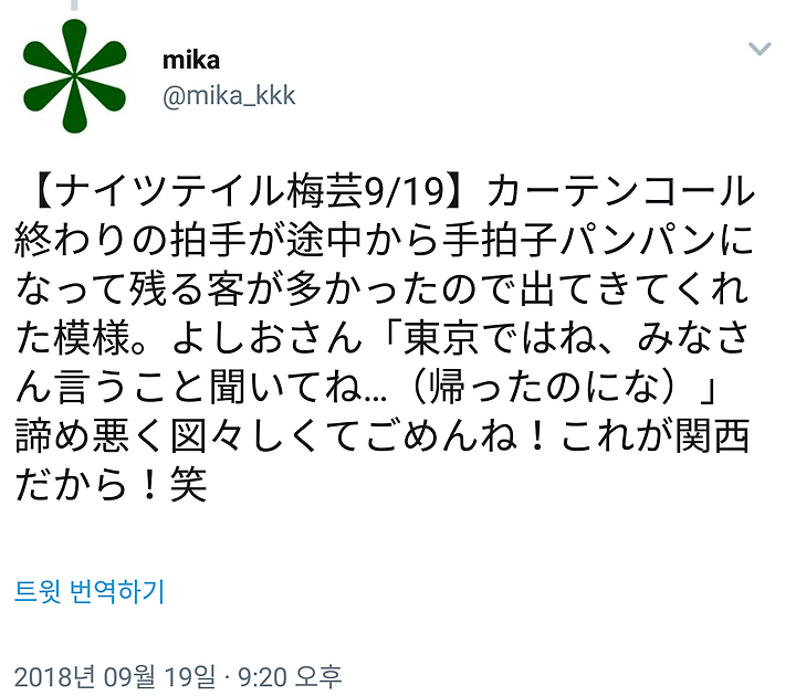 [나이츠 테일 우메게 9/19] 커튼콜 끝의 박수가 도중부터 손 박자 팡팡팡으로 되어서 남아있는 손님이 많서 나와준 모양. 요시오상 "도쿄에서는 말야, 여러분 말 잘 듣고 (돌아가는데.." 포기하지 않고 뻔뻔해서 미안요! 이것이 간사이니까! ㅎㅎ
