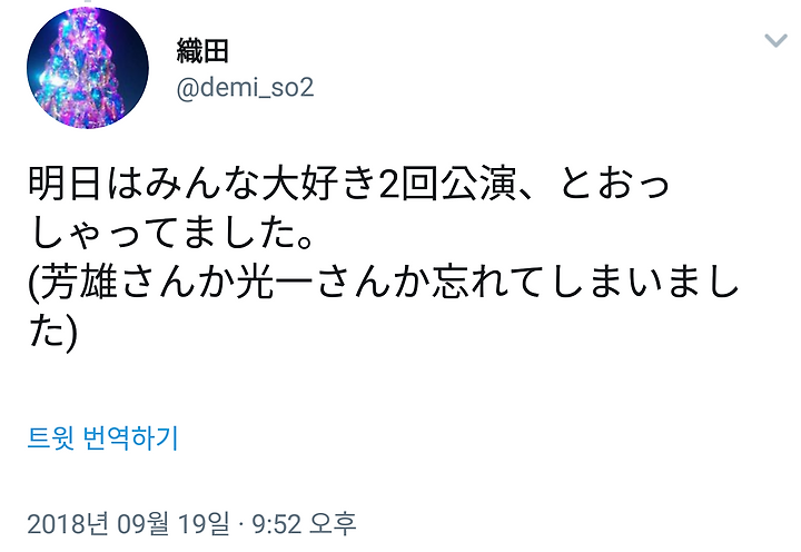 코이치상 커튼콜에서 "손님에게 응석 부리지 않고 열심히 하고 싶네" 적인 말을 해서 코이치상답네 라고 생각했지만 요시오상 "엣? 어리광 부린다는 것은?" 이라는 느낌이 되어서 뭔가 신선했다 w