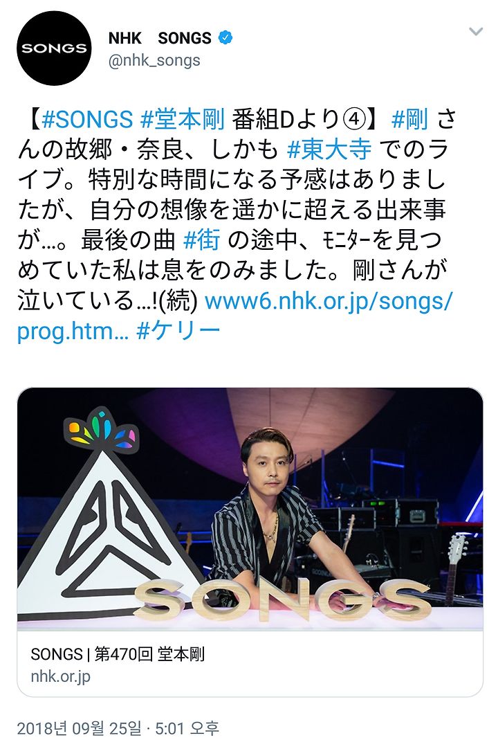 【#SONGS #堂本剛 番組Dより④】#剛 さんの故郷・奈良、しかも #東大寺 でのライブ。特別な時間になる予感はありましたが、自分の想像を遥かに超える出来事が…。最後の曲 #街 の途中、モニターを見つめていた私は息をのみました。剛さんが泣いている…!(続) https://t.co/d9MQvfYsnt #ケリー