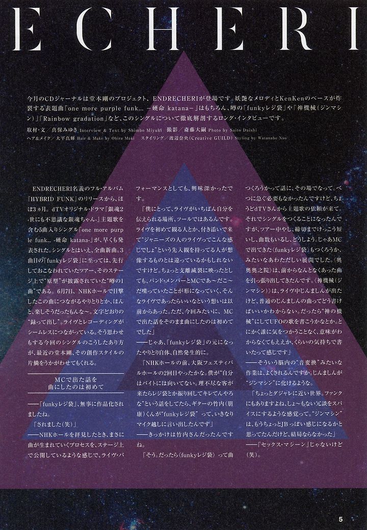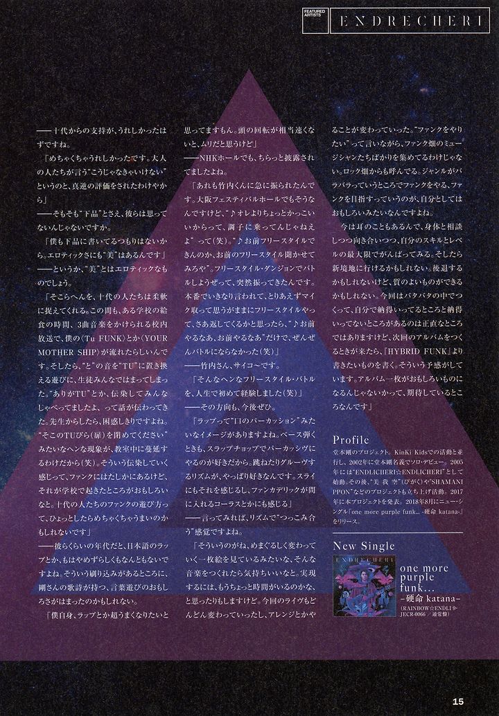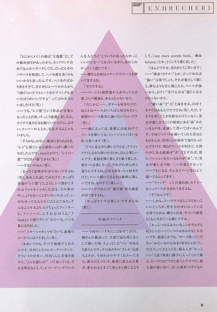 ENDRECHERI 명의의 풀 앨범 『HYBRID FUNK』의 릴리즈로부터 거의 3개월. dTV 오리지널 드라마 『은혼2 - 기묘한 긴짱-』주제가를 포함한 5곡 들어간 싱글 「one more purple furnk... - 硬命 katana -」가 빠르게도 발매되었다. 싱글이라고는 해도 전곡 신곡. 3곡 째의「funky レジ袋」에 이르러서는 선행해서 실시된 투어 그 스테이지 상에서 "원형"이 피로되었던 "소문의 1곡"이다. 6월 7일 NHK홀에서 목격했던 이 곡으로 이어지는 대화라든지 정말 즐거워보였었네~ 문자 그대로의 "녹음해서 발매". 라이브와 레코딩이 경계없이 이어져있다. 그렇게 생각하게 만드는 이번 싱글의 이러한 존재 방식이 최근의 도모토 쯔요시, 그 창작 스타일의 한 조각을 엿보게도 해준다.