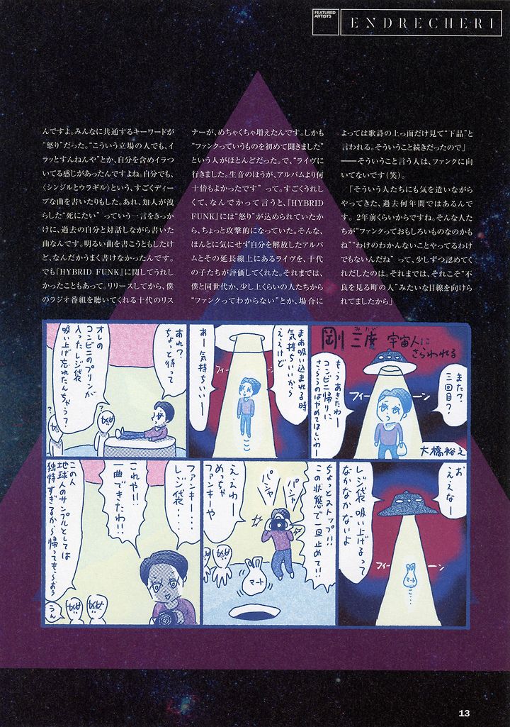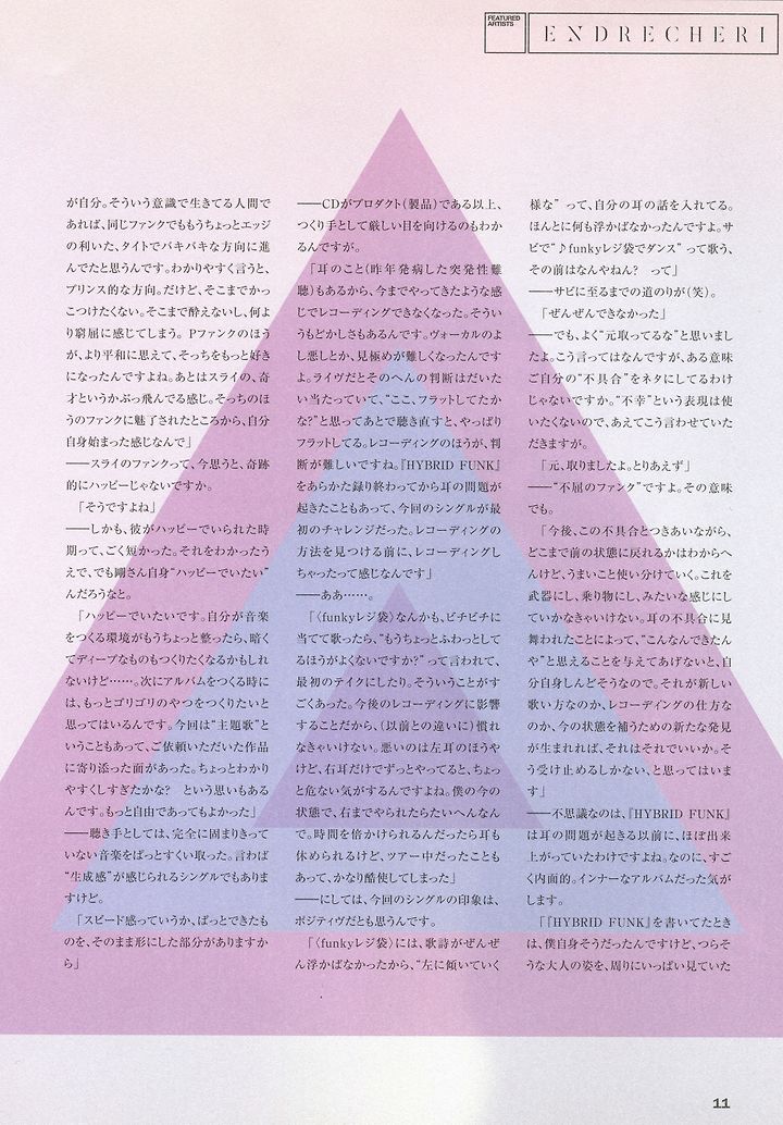 『HYBRID FUNK』를 쓰고 있었을 때는 제 자신도 그랬겠습니다만 괴로워 보이는 어른의 모습을 주위에서 잔뜩 보고 있었어요. 모두에게 공통된 키워드가 "분노"였던. "이런 입장의 사람이어도 짜증이 나는구나" 라든가 자신을 포함해 짜증이 나있는 느낌이 있었네요. 스스스로도 <シンジルとウラギル> 라고 하는 매우 딥한 곡을 쓰거나도 했던. 저거, 지인이 내뱉은 "죽고 싶어"라고 하는 한 마디를 계기로 과거의 자신과 대화하면서 쓴 곡입니다. 밝은 곡을 쓰려고도 했지만 왠지 잘 쓰지 못했어요. 하지만 『HYBRID FUNK』에 관해서 기뻤던 것도 있어서. 릴리즈 하고나서 저의 라디오 방송을 들어주는 10대 리스너가 엄청 늘었어요. 게다가 "Funk라고 하는 것을 처음 들었습니다"라는 사람이 대부분이었던. 그래서 "라이브에 갔습니다. 생음 쪽이 앨범보다 몇 십배나 좋았습니다"라고. 굉장히 기뻐서 왜인가 하면『HYBRID FUNK』에는 "분노"가 담겨져 있었기 때문에 조금 공격적으로 되어있었던. 그런, 정말로 신경쓰지 않고 자신을 해방한 앨범과 그 연장선상에 있는 라이브를 10대 아이들이 호평해주었던 것. 그 때까지는 저와 동세대나 조금 위 정도의 사람들로부터 "Funk란 모르겠어" 라든가 상황에 따라서는 가사의 표면만을 보고 "천하다(下品)" 라고 듣는. 그런 일의 역속이었기 때문에.
