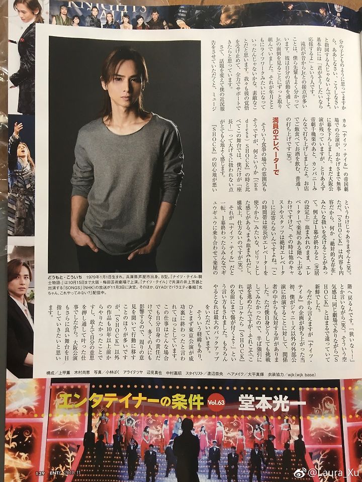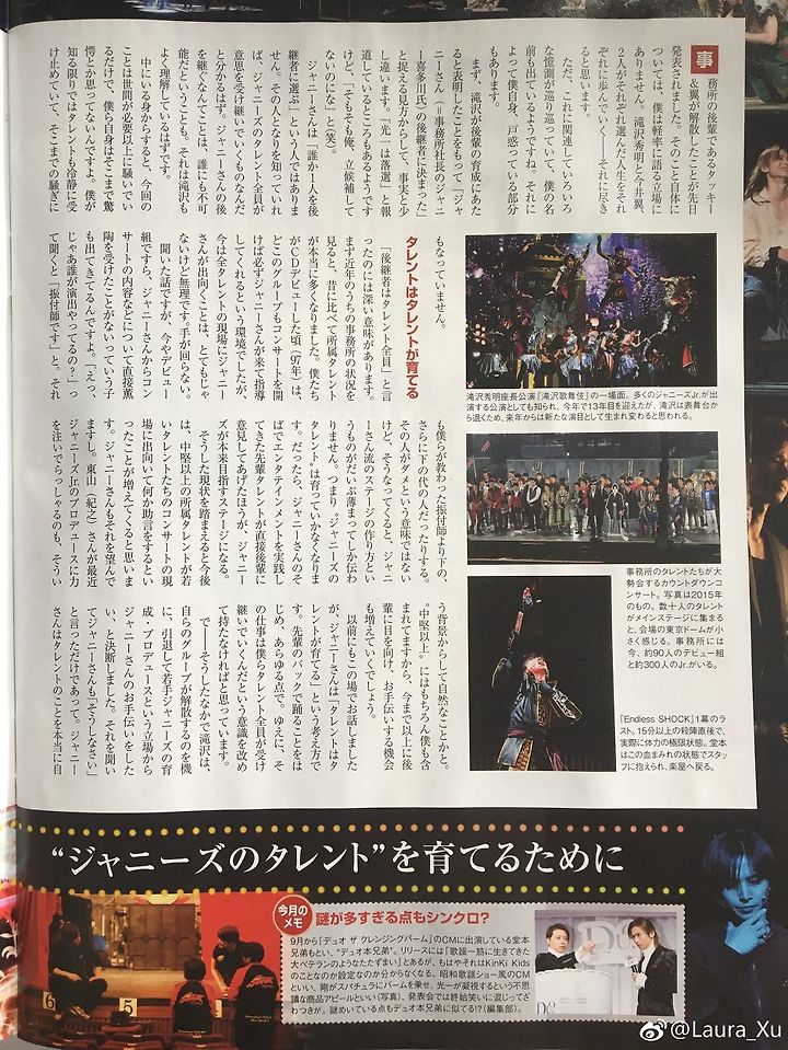 그런 경위도 있어 우선 도쿄 공연이 성공리에 마쳤다고 들어 안심하고 있습니다. 이 일은 어떤 경우에도 자기자신의 책임뿐만이 아니라 많은 사람에게 영향을 주기 떄문에 주위의 의견을 듣고 행동에 옮기는 경우 쪽이 많습니다만『SHOCK』이외의 작품도 10년 이상 전부터 하고 싶었던 것이고, 억지로 자신의 의견을 밀어부쳐 이룬 일이니까요. 오사카 공연도 더욱 좋은 무대를 목표로 해가고 싶다고 생각합니다.