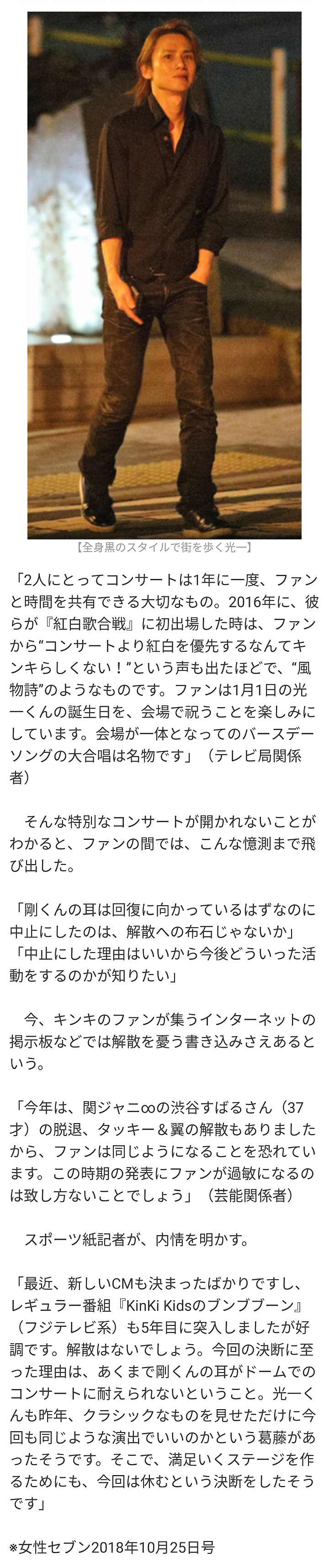 최근 새 CF도 결정된 지 얼마 안 됐고, 정규 프로그램 Kin Ki Kids의 붕부붕 (후지TV 계열)도 5년째에 돌입했지만 호조입니다. 해산하지는 않을 겁니다. 이번 결정을 내린 이유는 어디까지나 쯔요시군의 귀가 돔에서의 콘서트에 견딜 수 없다는 것. 코이치군도 작년에 클래식한 것을 보여 준 만큼 이번에도 같은 연출이어도 좋은 것인가 라는 갈등이 있었다고 합니다. 그래서 만족스러운 스테이지를 만들기 위해서라도 이번에는 쉰다는 결정을 했다고 합니다.