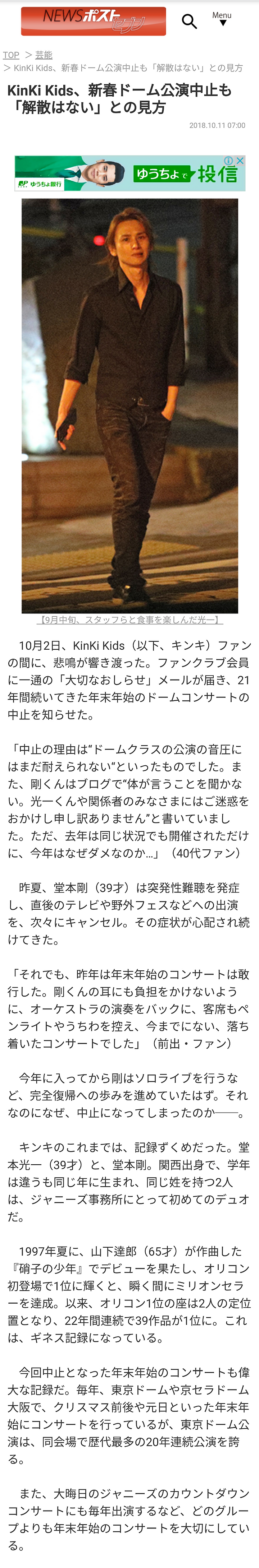10월 2일, KinKi Kids(이하, 킨키) 팬의 사이에, 비명이 울려 퍼졌다. 팬클럽 회원에게 한 통의 중요한 소식 메일이 전달되어 21년간 계속돼 온 연말연시 돔 콘서트 중지를 알렸다.