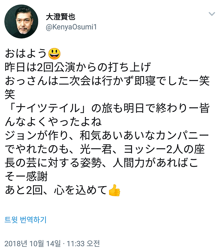 ジョンが作り、和気あいあいなカンパニーでやれたのも、光一君、ヨッシー2人の座長の芸に対する姿勢、人間力があればこそー感謝