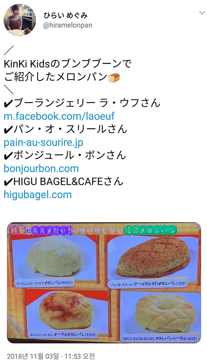 [KinKi Kids] 11/3 붕부붕 메론빵 전문가平井萌 (히라이 메구미)상 트윗