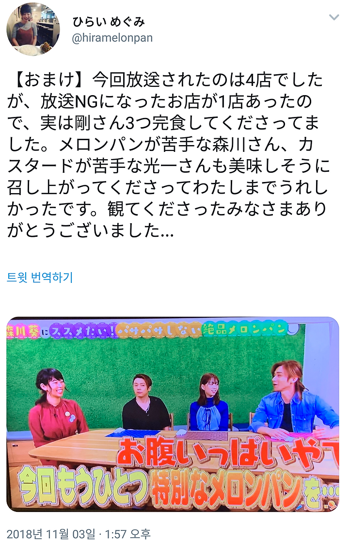 【おまけ】今回放送されたのは4店でしたが、放送NGになったお店が1店あったので、実は剛さん3つ完食してくださってました。メロンパンが苦手な森川さん、カスタードが苦手な光一さんも美味しそうに召し上がってくださってわたしまでうれしかったです。観てくださったみなさまありがとうございました...