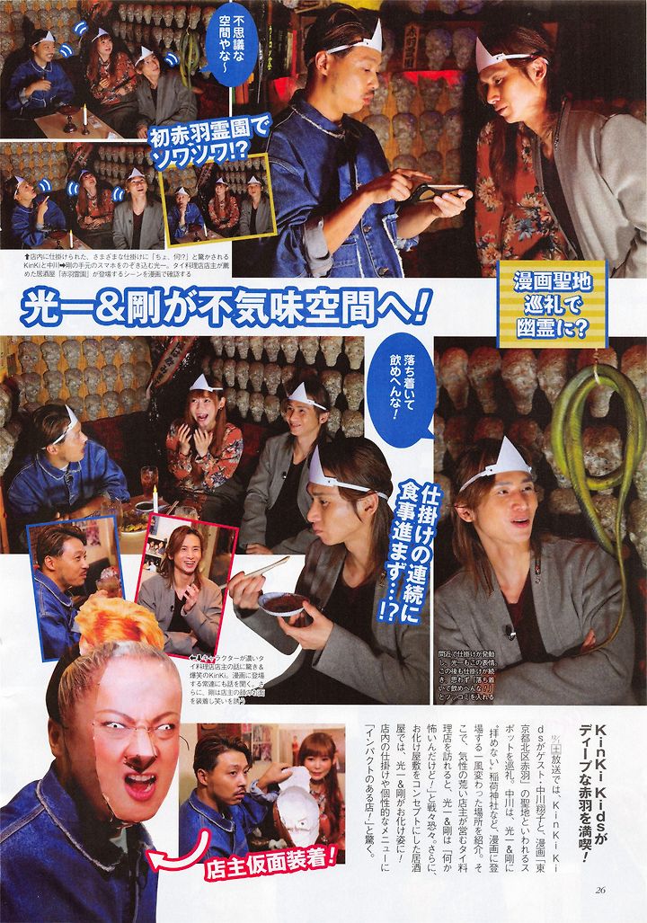 12/1(토) 방송에서는 KinKi Kids가 게스트 나카가와 쇼코와 만화 "도쿄도 키타구 아카바네(東京都北区赤羽)" 의 성지라고 일컬어지는 스팟을 순례. 나카가와는 코이치 & 쯔요시에게 "참배할 수 없는" 이나리 신사 등 만화에 등장하는 어딘가 색다른 장소를 소개. 거기서 거친 기질의 점주가 운영하는 타이 요리점을 방문하자 코이치 & 쯔요시는 "뭔가 무서운데 말이지!" 라고 전전긍긍. 더욱이 귀신의 집을 컨셉으로 한 이자카야에서는 코이치 & 쯔요시가 귀신 모습으로! 점내의 장치나 개성적인 메뉴에 "임팩트 있는 가게!" 라고 놀란다