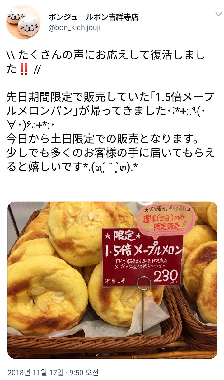 얼마 전 기간 한정으로 판매하고 있던 "1.5배 메론빵"이 돌아왔습니다.